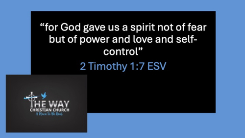 This verse, a great reminder for all of us, was written to Timothy, the Apostle Paul's young protege, as a word of encouragement. Timothy might have feared speaking in front of people, teaching the word of God, or maybe something else, but Paul gives him a real truth, you were not given a spirit of fear. This message is very much relevant to all of us today, we were not given a spirit of fear either, for fear has a way of stopping us from doing what God has called us to do, do not let fear stop you. But rather live in the manner in which the Lord has asked you to live, in power, living bold in your faith, walking by faith rather than by sight. In love, for fear will keep you from being able to be the real you, timidity keeps a person secluded within themselves, a place of isolation not love. And of self control, meaning God is in control of your life not fear. Living in the Spirit, walking in the Spirit is what the Lord has brought you too, live in Him, for fear is not in you, the Holy Spirit of God is, Jesus Saves!