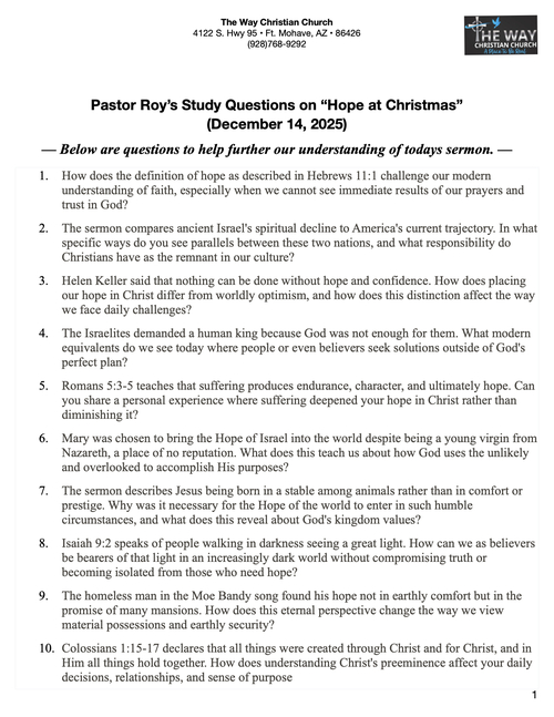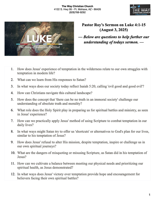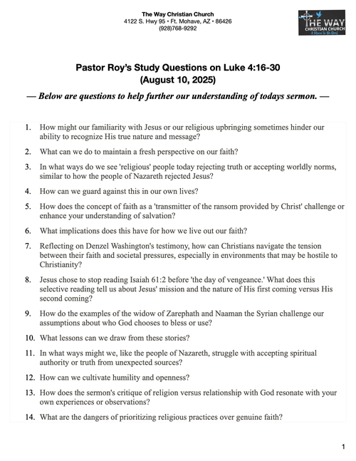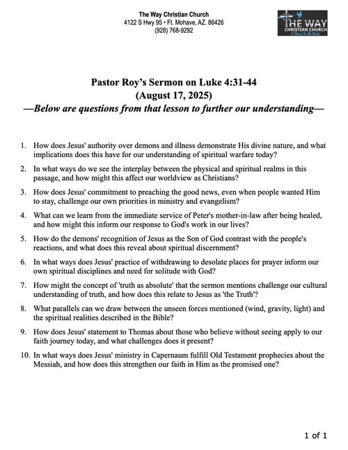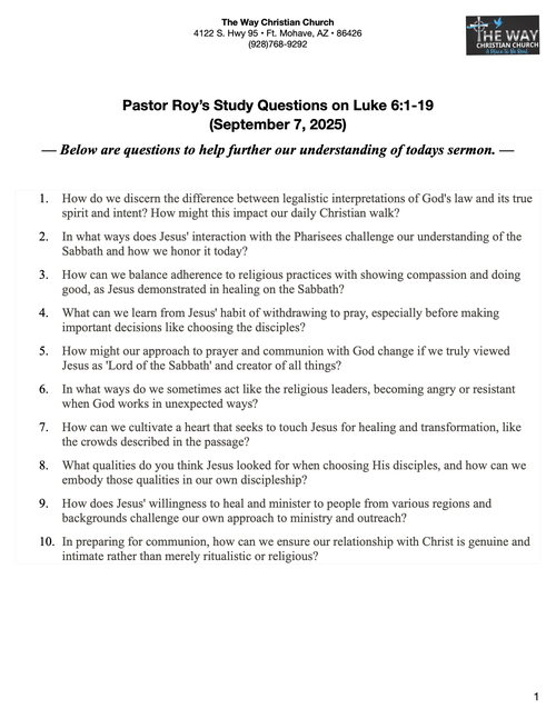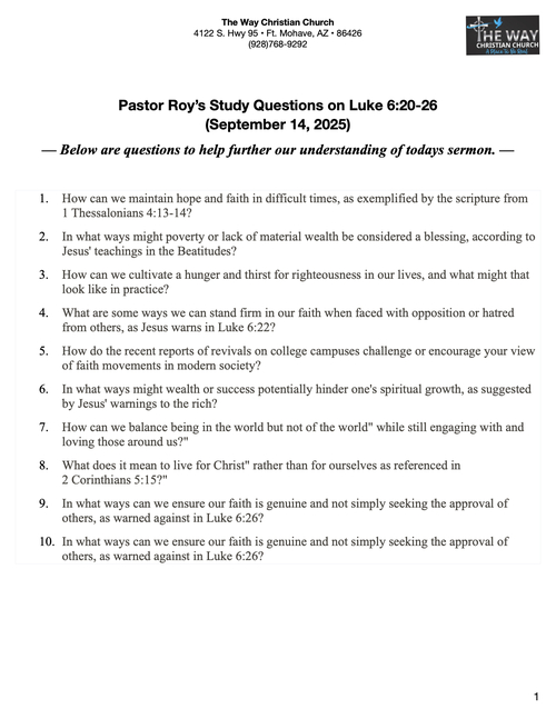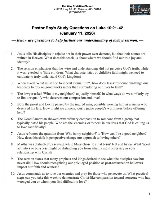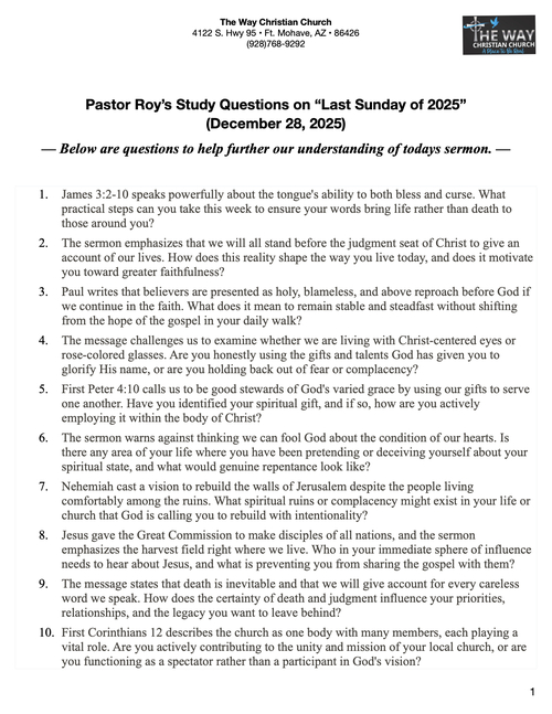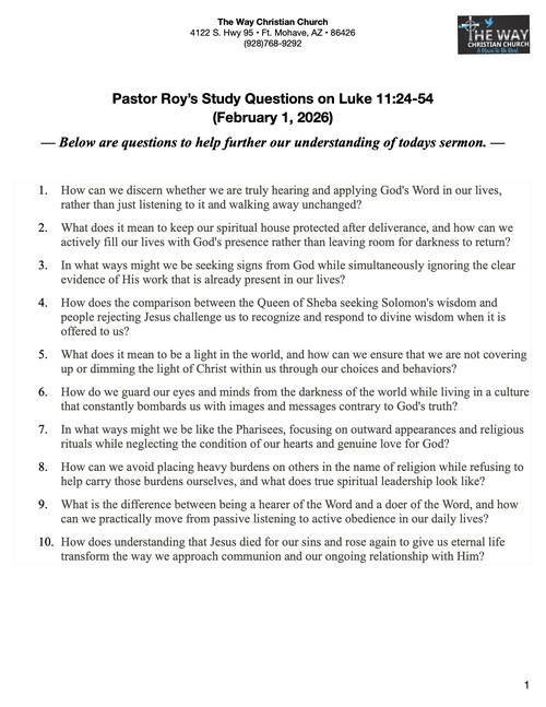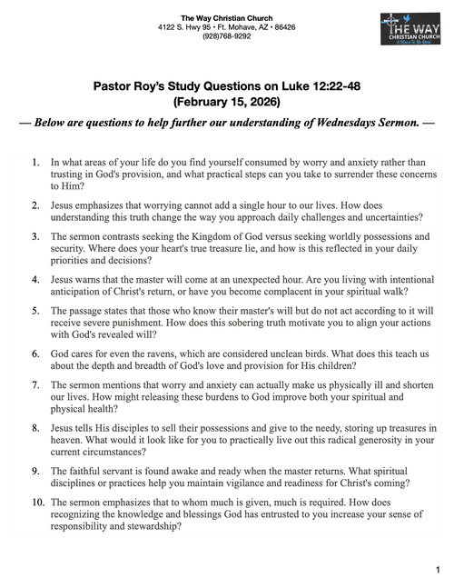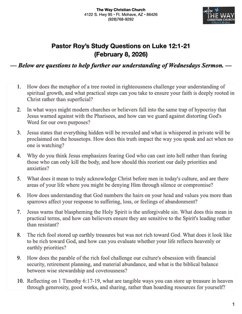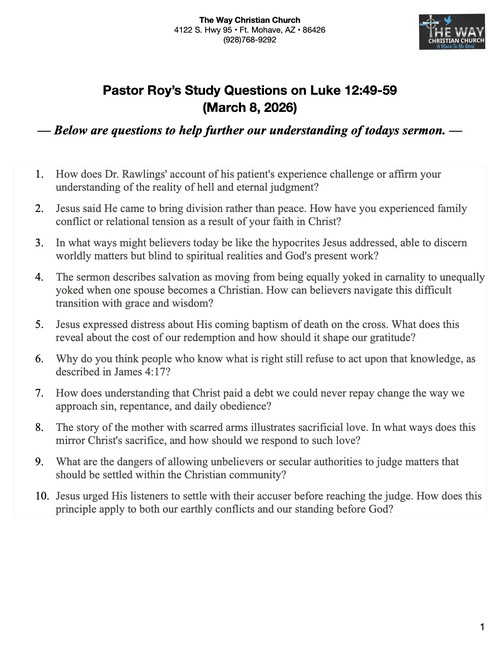 Pastor Roy's Study Questions on Luke 12:49-59 (March 8, 2026). There were no questions for March 1, 2026