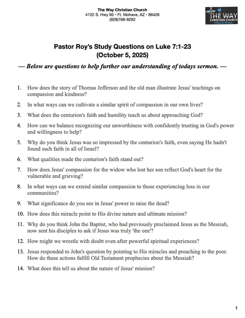Study Questions on Luke 7:1-23 (October 5, 2025).