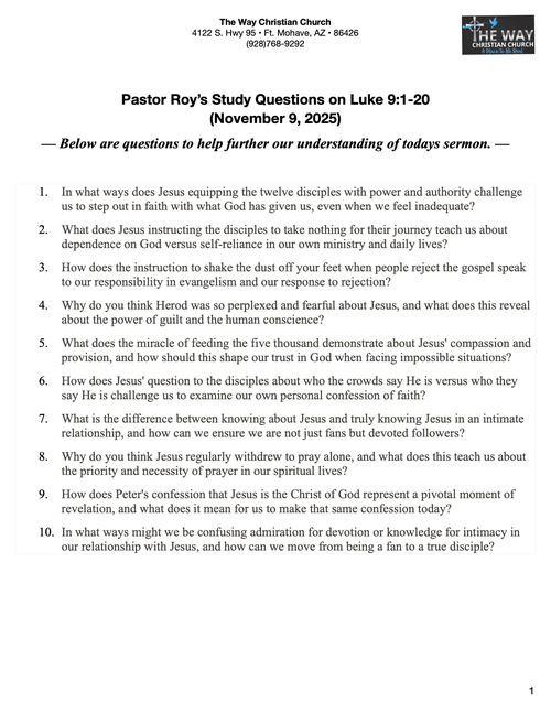 Study Questions on Luke 9:1-20 (November 9, 2025).