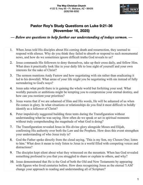 Study Questions on Luke 9:21-36 (November 16, 2025).
