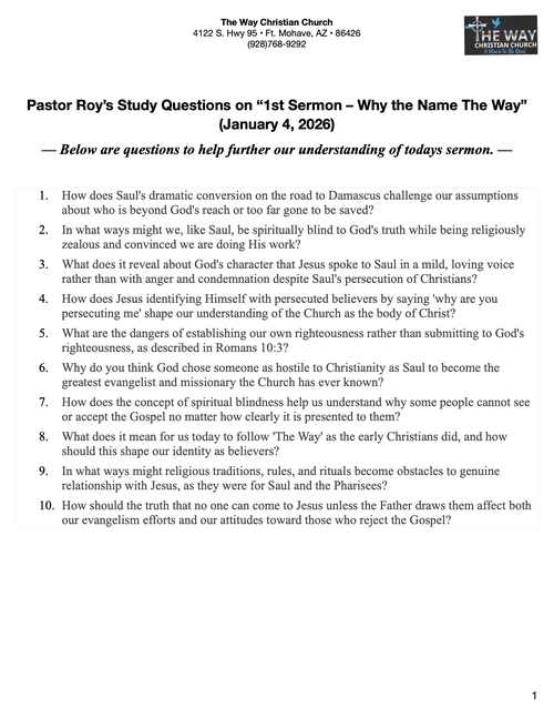 Study Questions on "1st Sermon – Why the Name The Way (January 4, 2026).