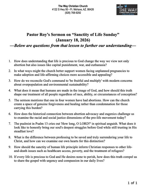 Study Questions on "Sanctity of Life Sunday" (January 18, 2026).