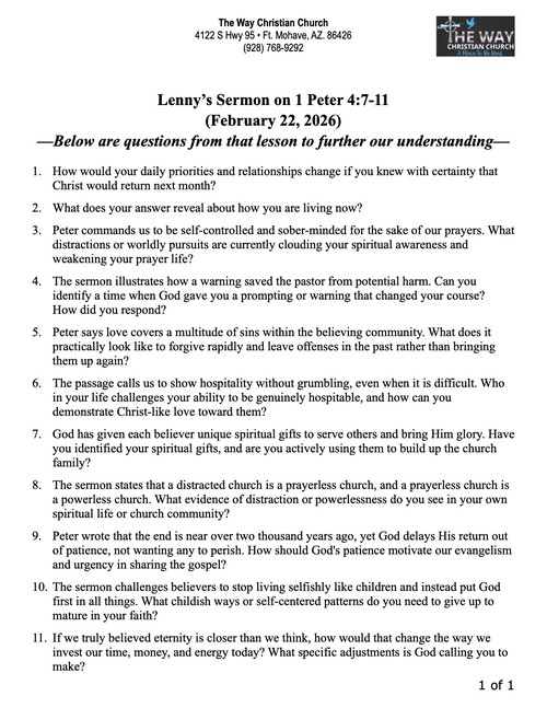 Study Questions on 1 Peter 4:7-11 (February 22, 2026).