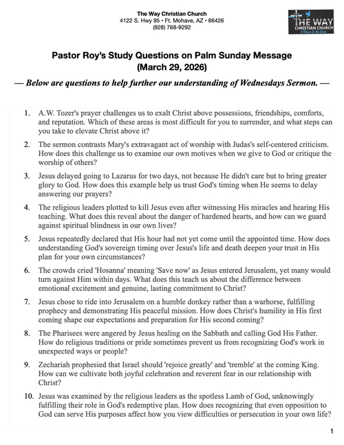 Pastor Roy's Study Questions on Palm Sunday Message (March 29, 2026).